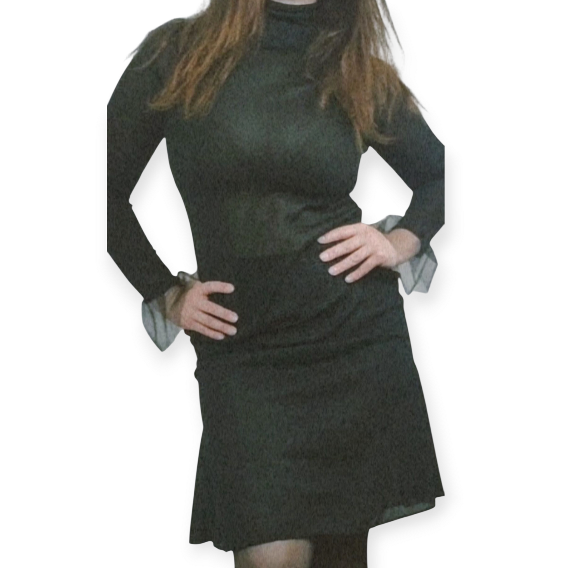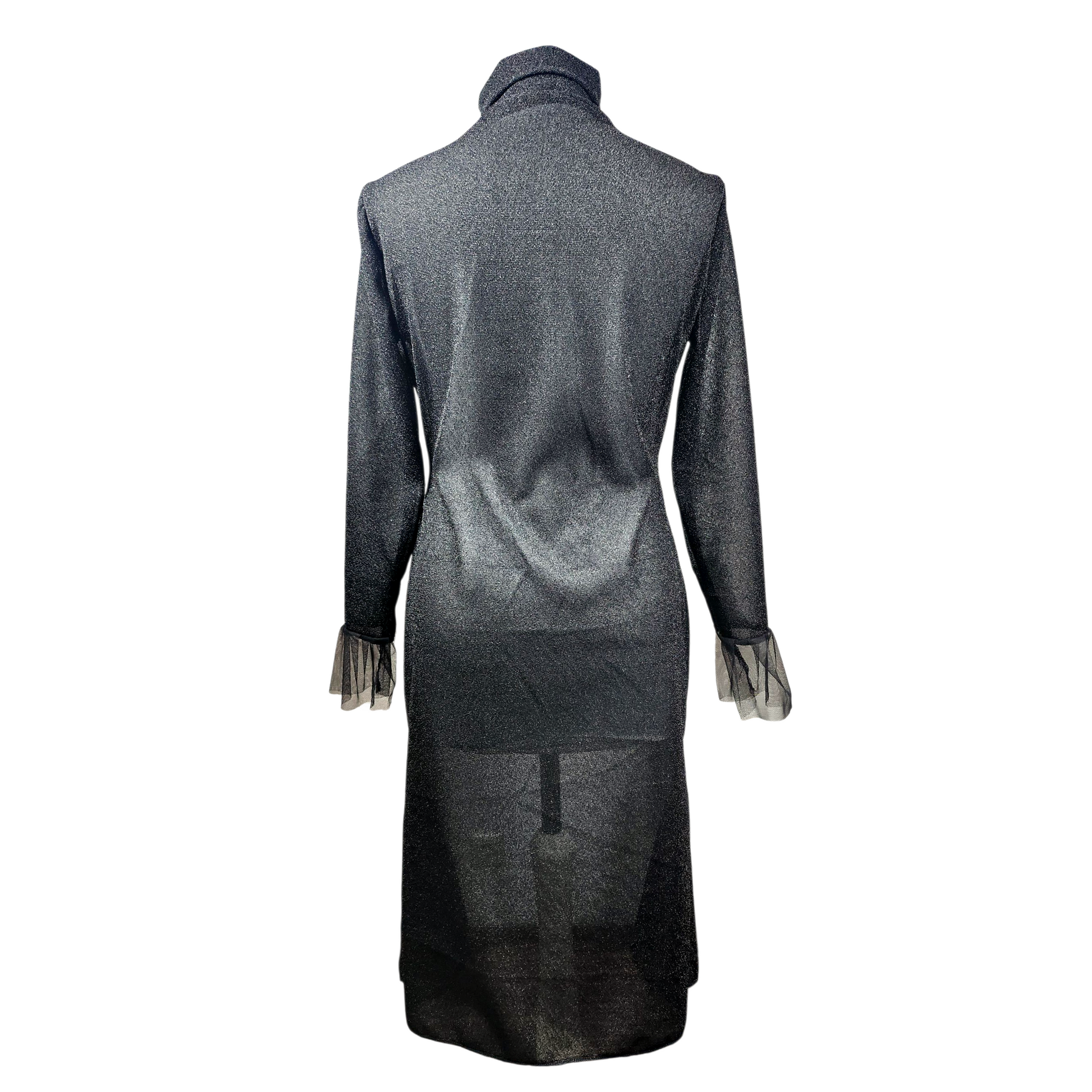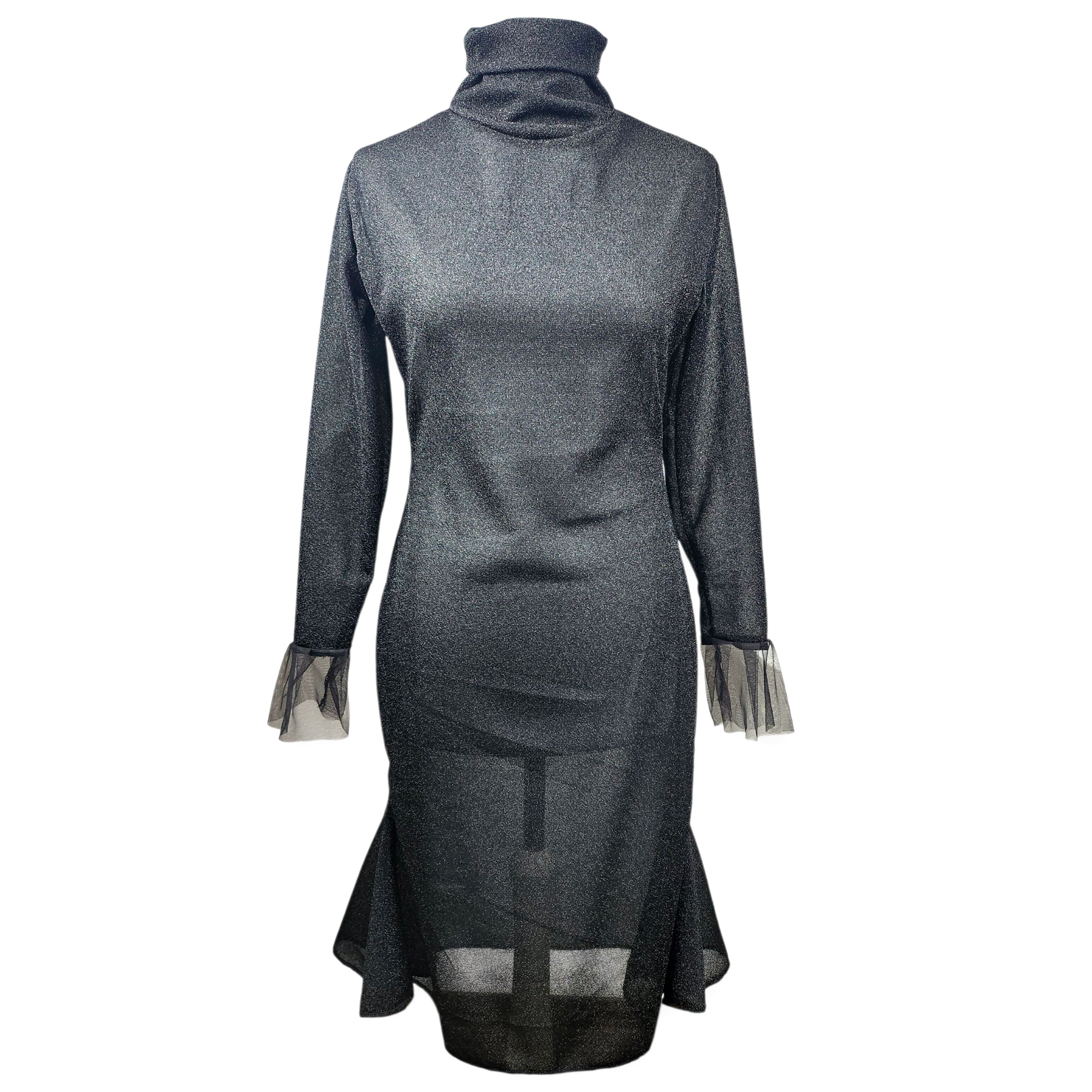 Dieses wadenlange, durchsichtige, querelastische Kleid ist ein absoluter Blickfang und die perfekte Wahl für mutige Fashionistas. Es ist figurbetont geschnitten und setzt Ihre Silhouette gekonnt in Szenne, während der elegante Rollkragen und die langen Ärmel mit ihren raffinierten Tüll- Einsätzen für eine aufregende Mischung aus klassischer Eleganz und verführerischer Transparenz sorgen. Tragen Sie es mit einem Slip- Kleid oder Body darunter für einen stilvollen Abend- Look und ziehen Sie alle Blicke auf sich.