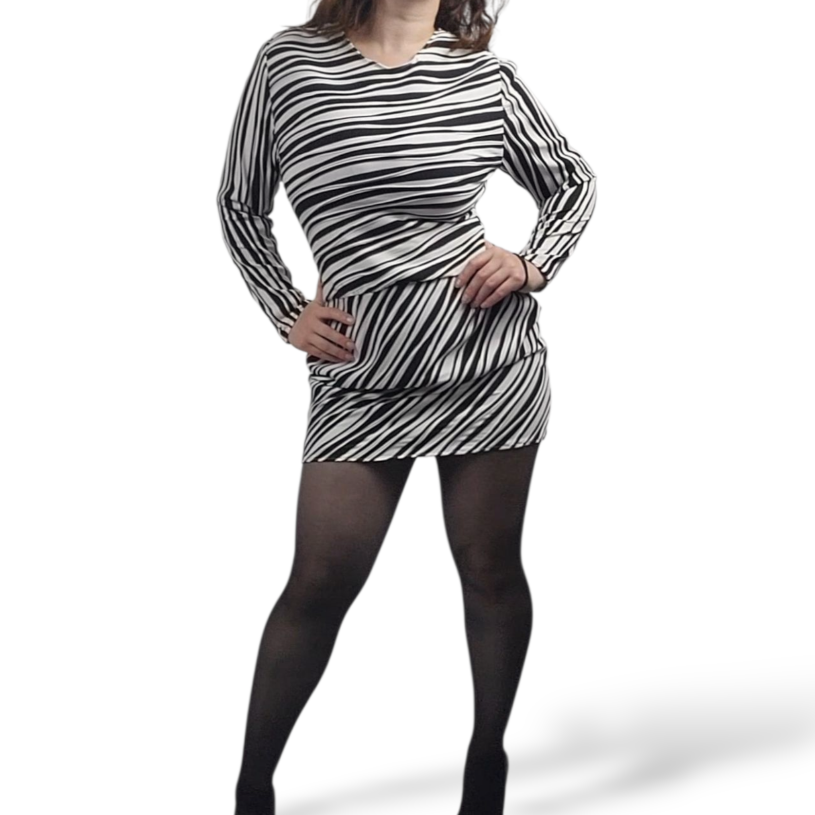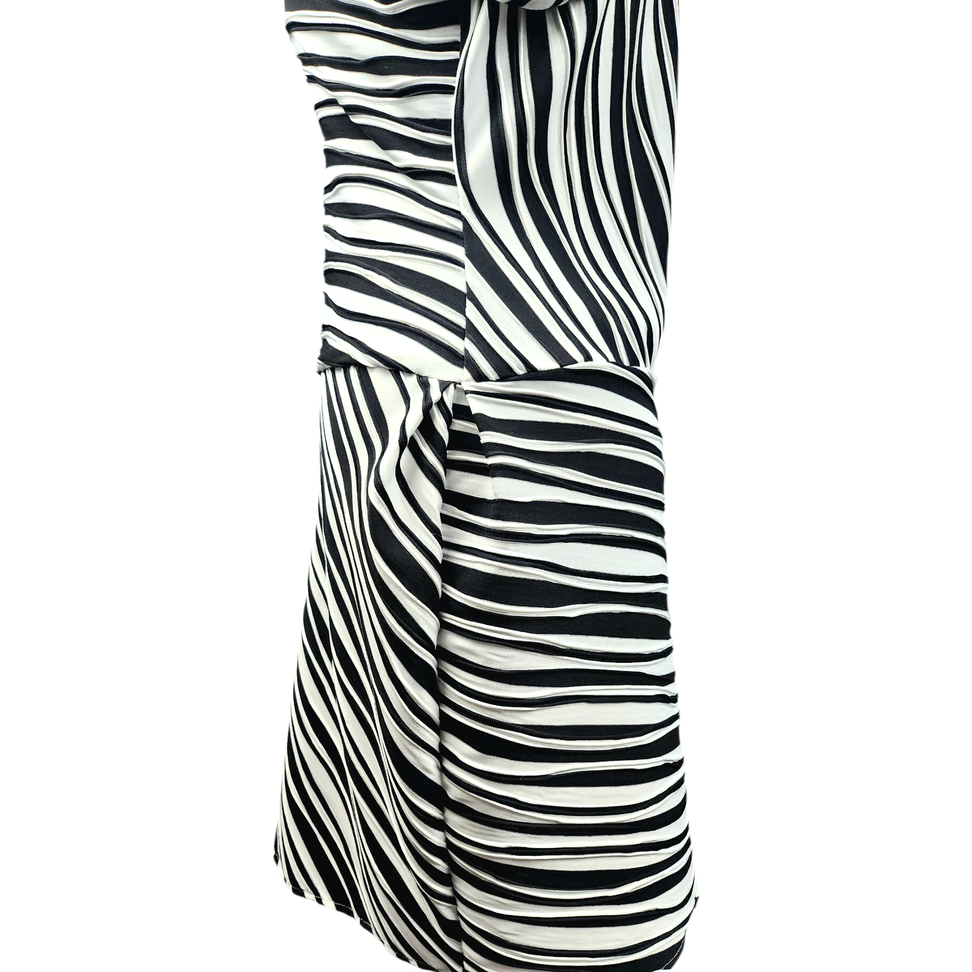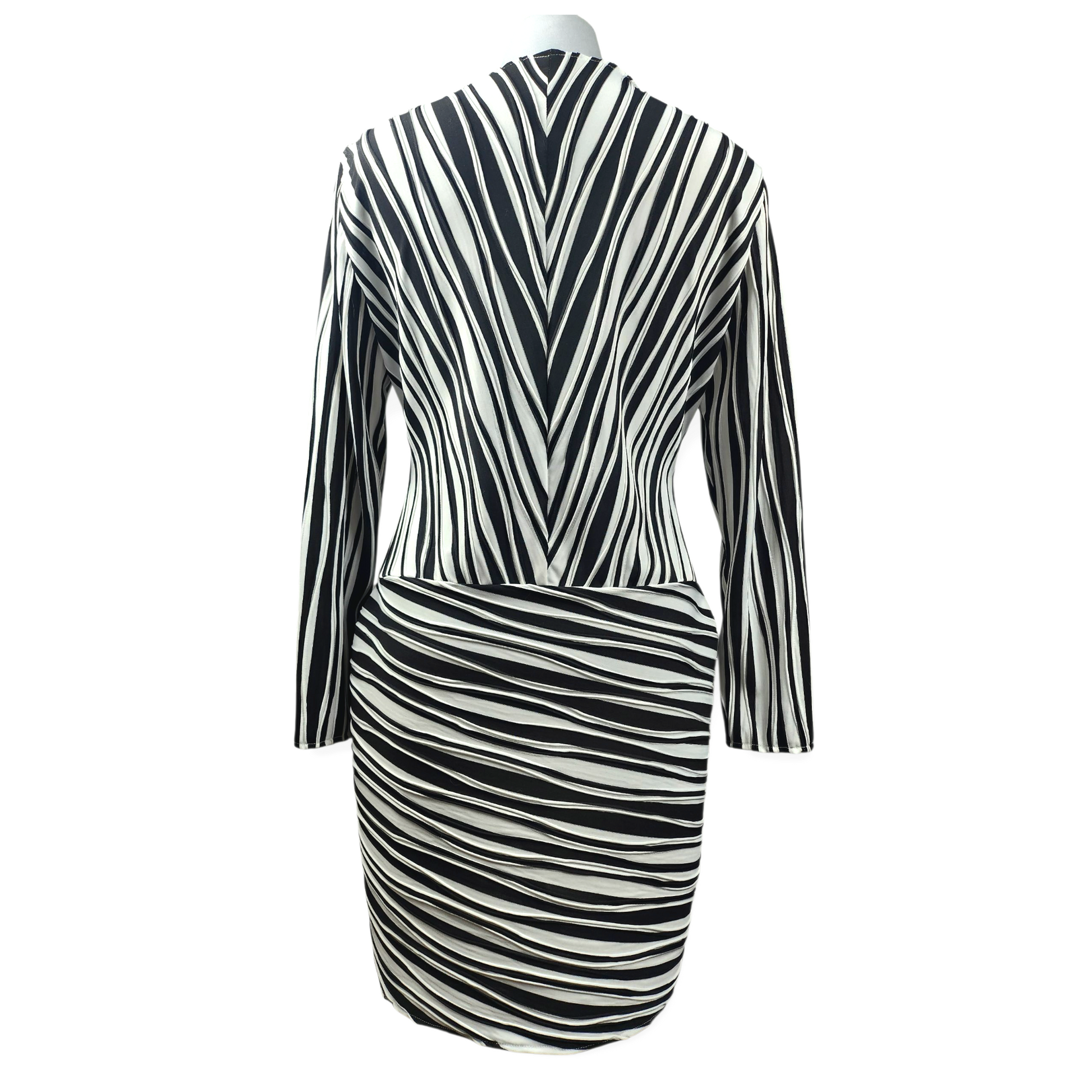Das einzigartige Stück wurde mit viel Liebe zum Detail gefertigt. Die taillenbetonte Silhouette zaubert eine wunderschöne Sanduhr- Form, während der kurze, hüftlange Schnitt Ihre Beine optisch verlängert. Das Highlight dieses Kleides sind die asymmetrisch platzierten Falten an den Seiten des Rocks. Sie verleihen dem Design eine moderne Note, die dieses Kleid zu einem unvergesslichen Einzelstück macht.